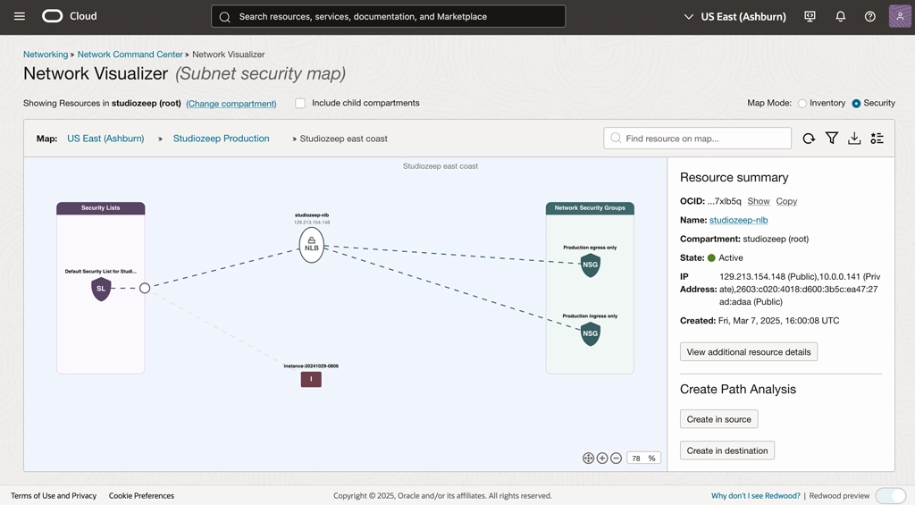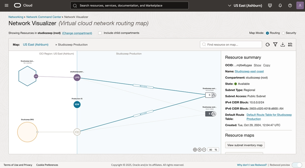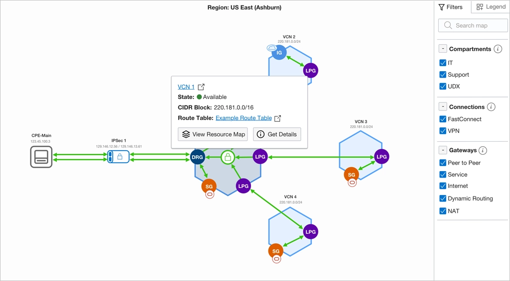 A native OCI service that provides a diagram of the implemented topology of virtual cloud networks and subnets with routing and security layouts within a region.