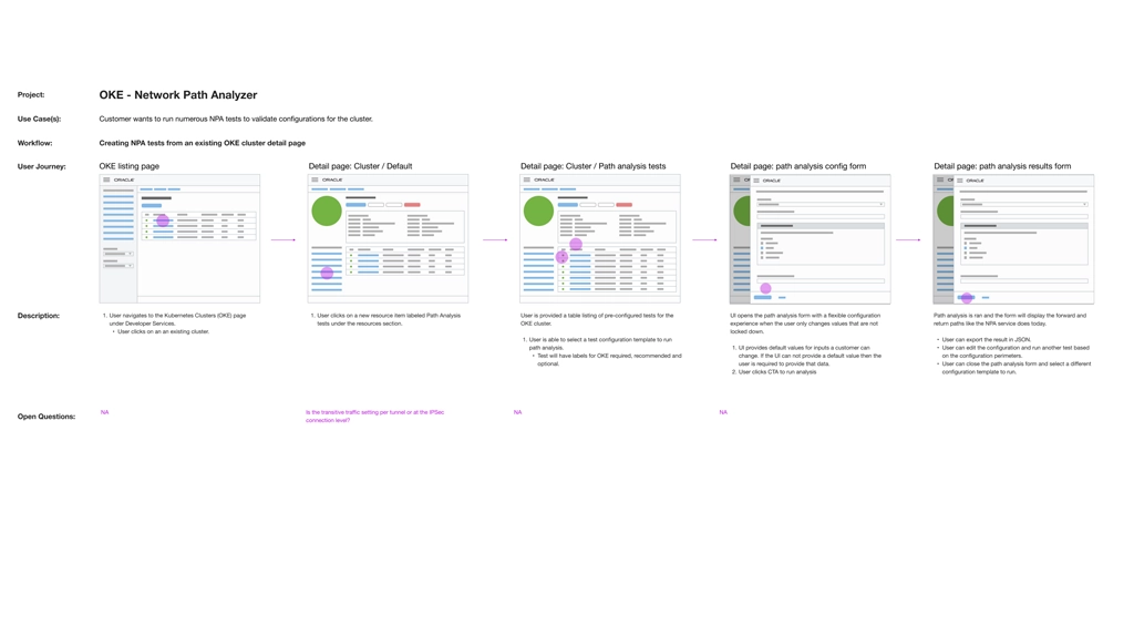 - Created user flows to show the process for creating a Network Path Analyzer test from the OKE cluster.
